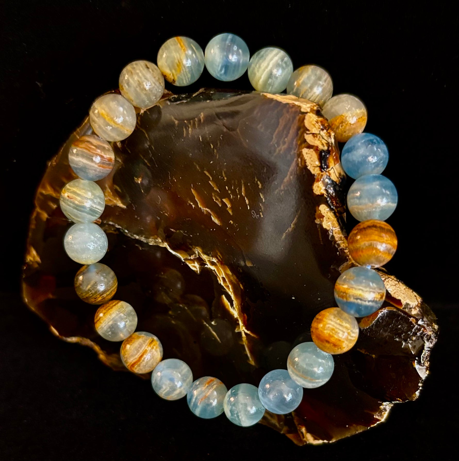 Dive into the calming energy of Aquatine Lemurian Calcite, a rare and mesmerizing stone with swirls of oceanic blues, earthy browns, and ethereal translucence. This 7.5” stretch bracelet is handcrafted with polished 8mm beads, offering a serene and grounded energy that’s perfect for daily wear.