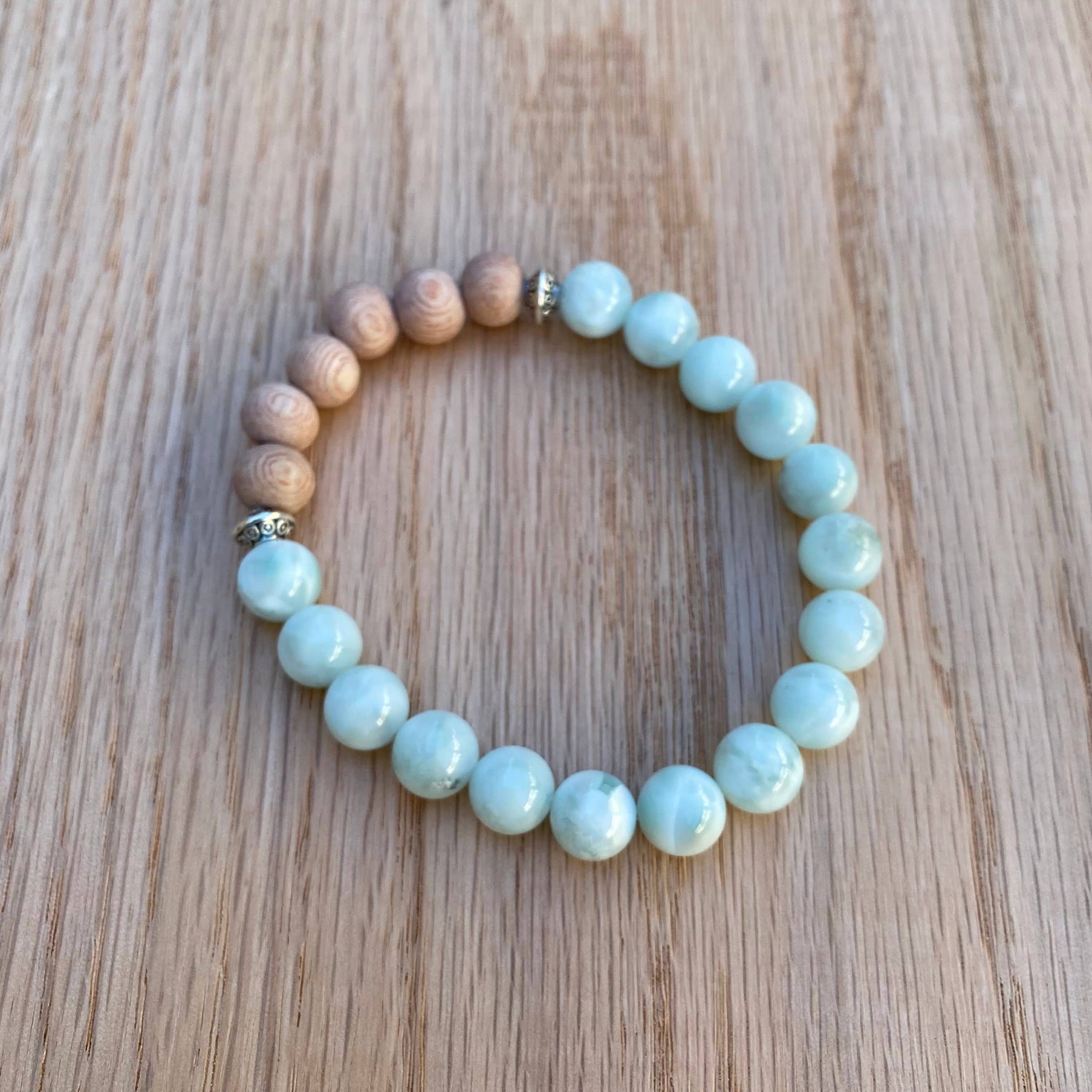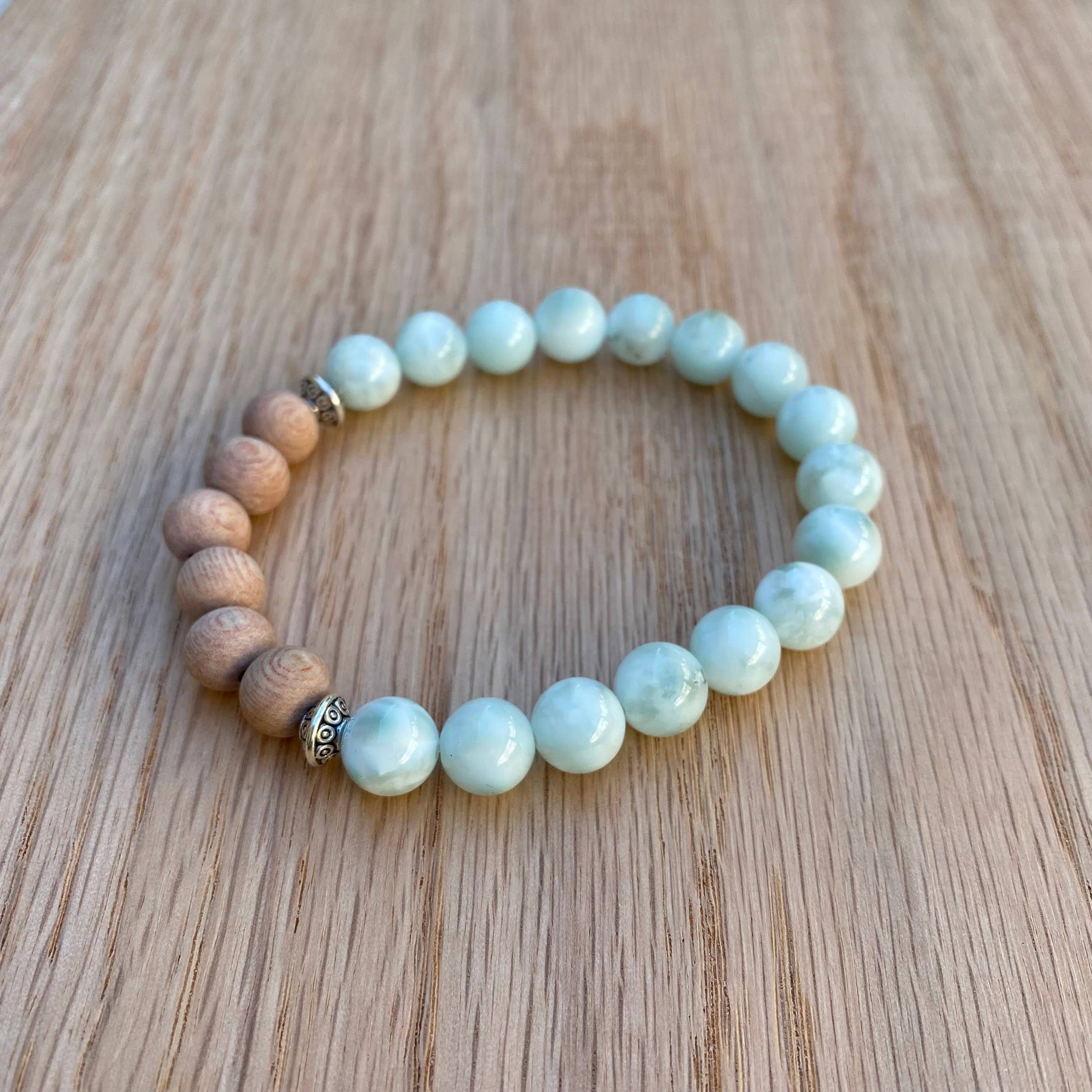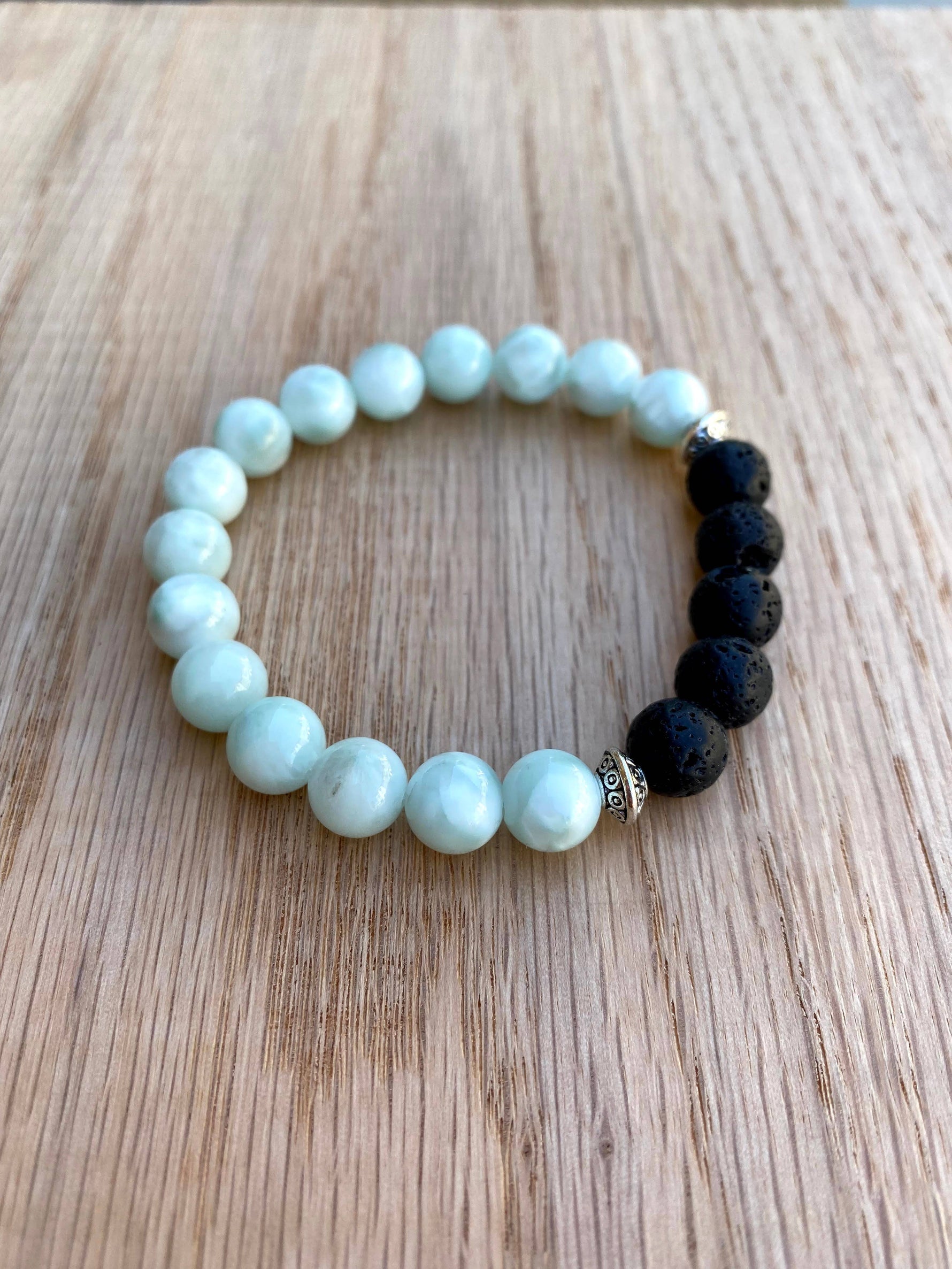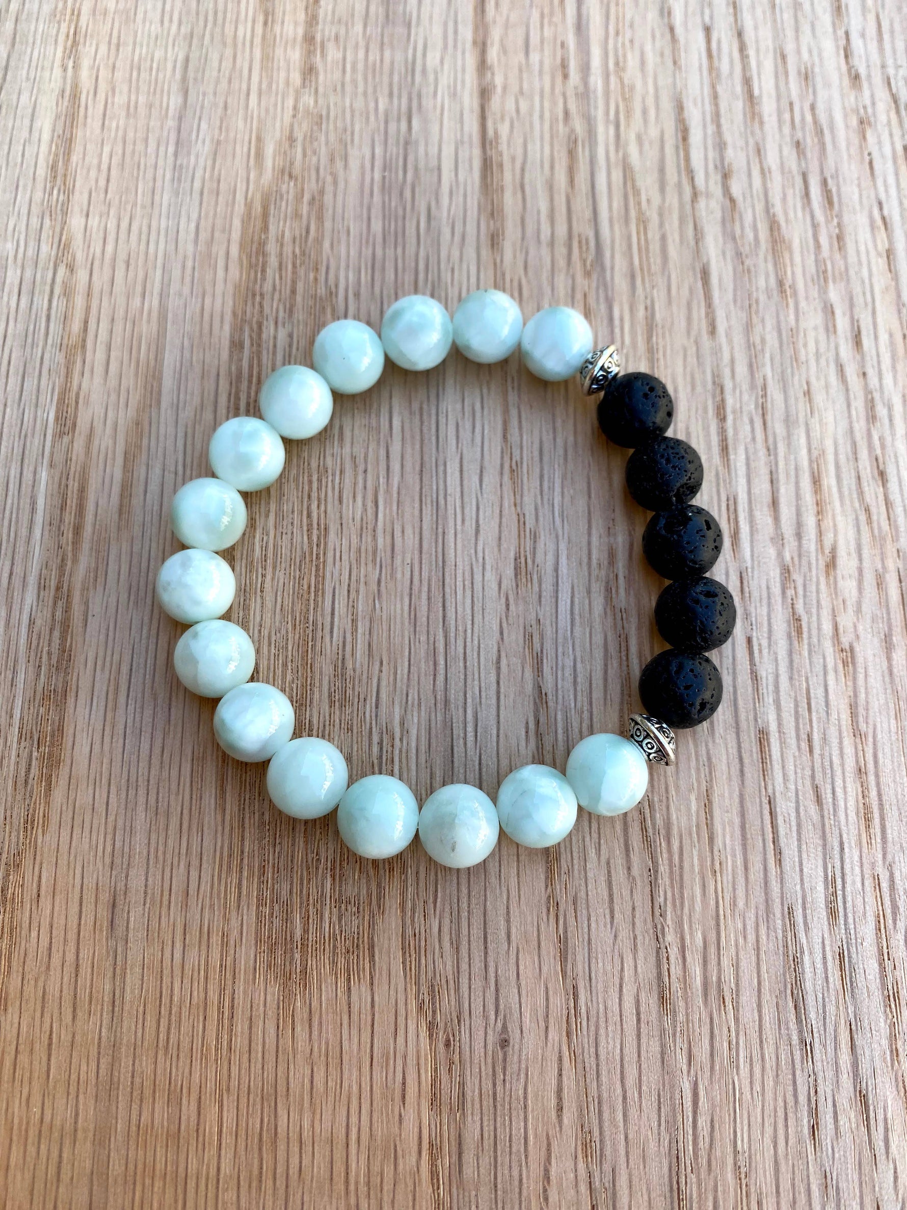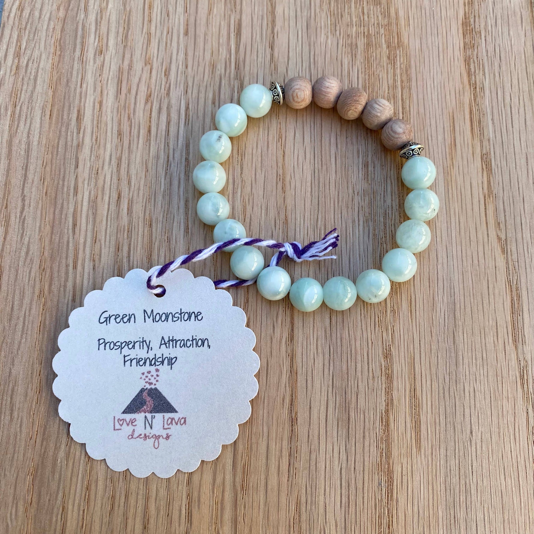 This bracelet features stunning Green Moonstone gemstones, lava stones or raw rosewood beads, and silver accent beads. Made with high quality elastic cord. Beads are 8mm, which is slightly larger than the size of a pea. *To use as a diffuser bracelet, apply a drop or two of 100% pure essential oil to the lava stones or rosewood beads. The scent will last for 1-2 days. *Bracelet tags include gemstone information and how to use as a diffuser.
