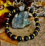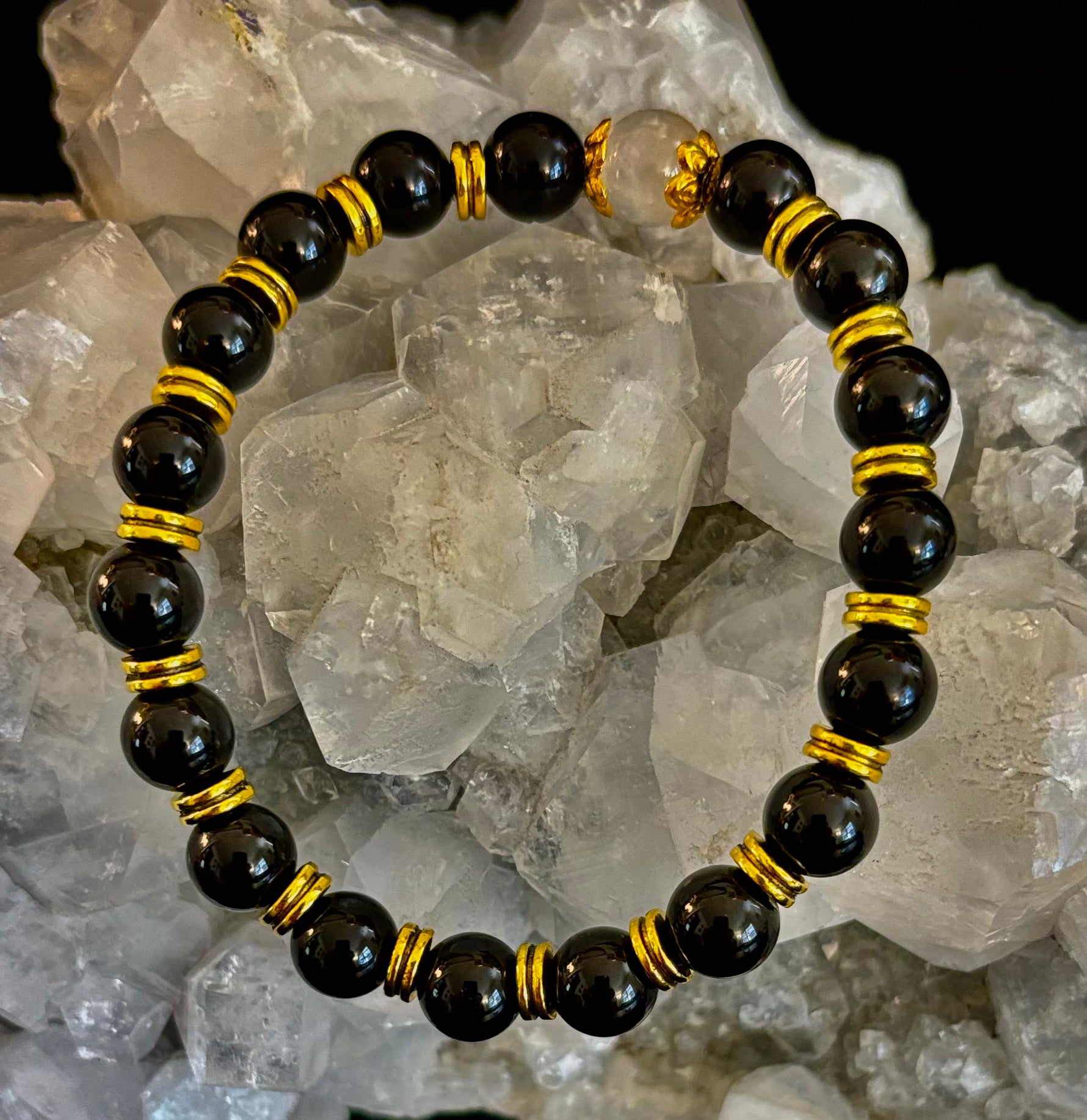 Find harmony between light and strength with the Divine Balance Bracelet, featuring a radiant combination of Selenite and Glossy Black Obsidian accented with elegant gold-toned metal beads. Designed to balance cleansing and grounding energies, this handcrafted stretch bracelet supports spiritual clarity, emotional stability, and protection.