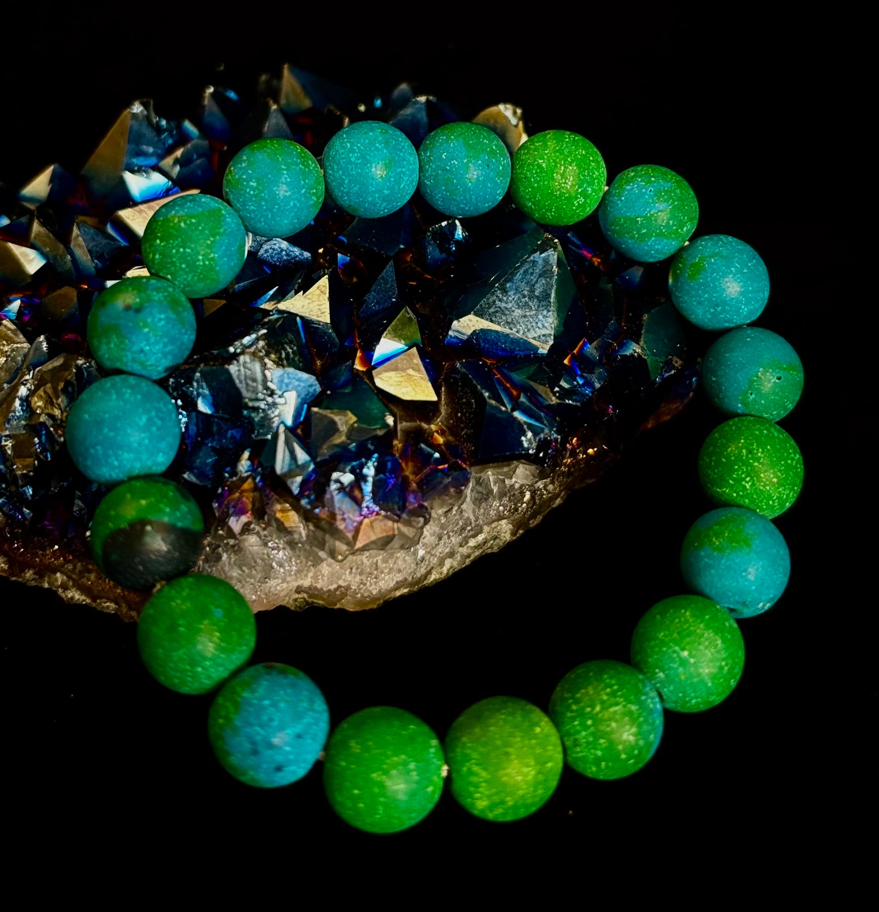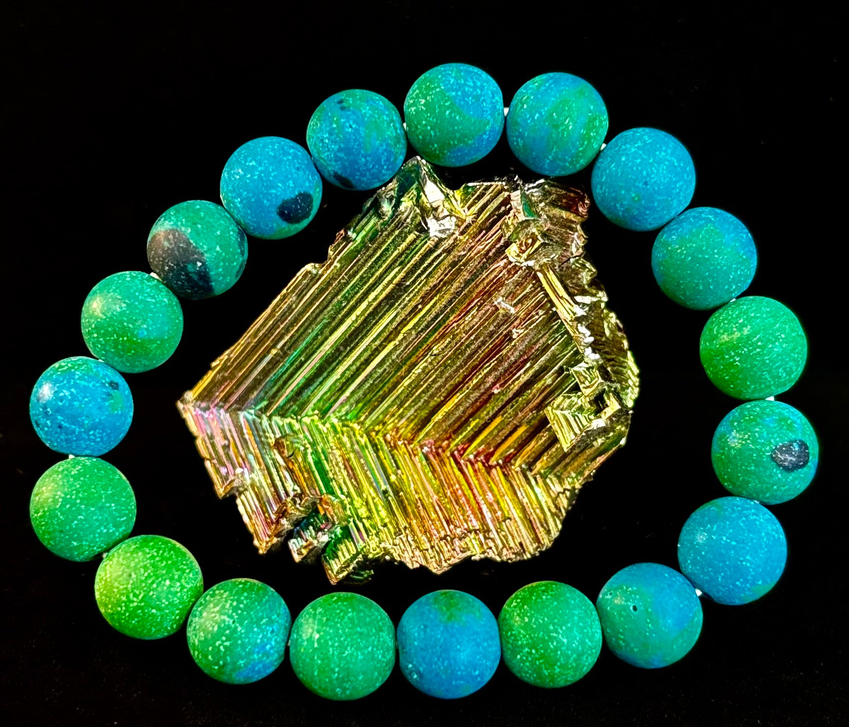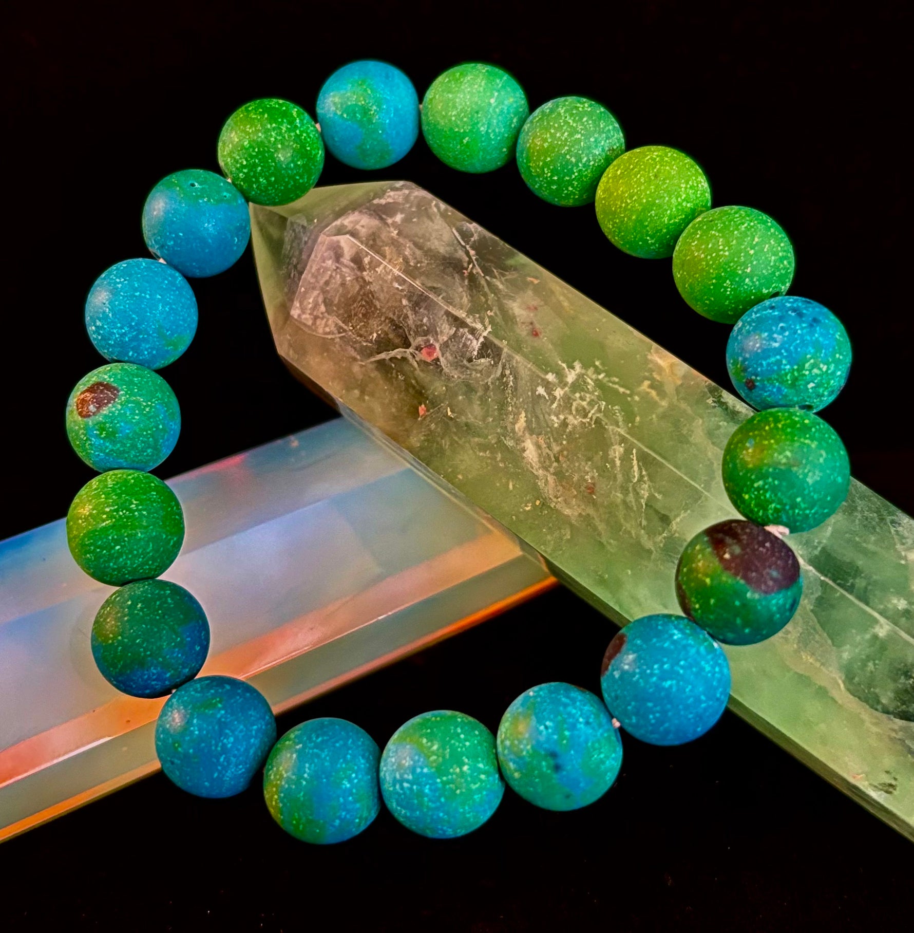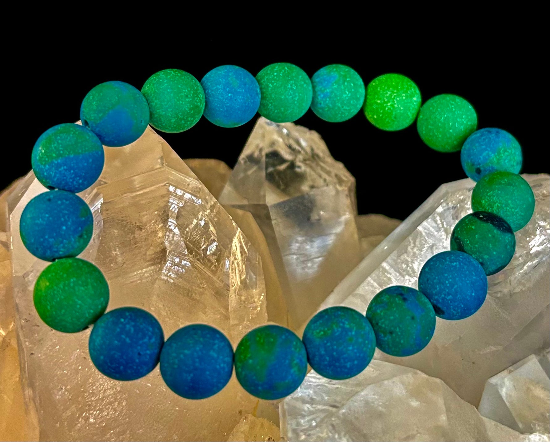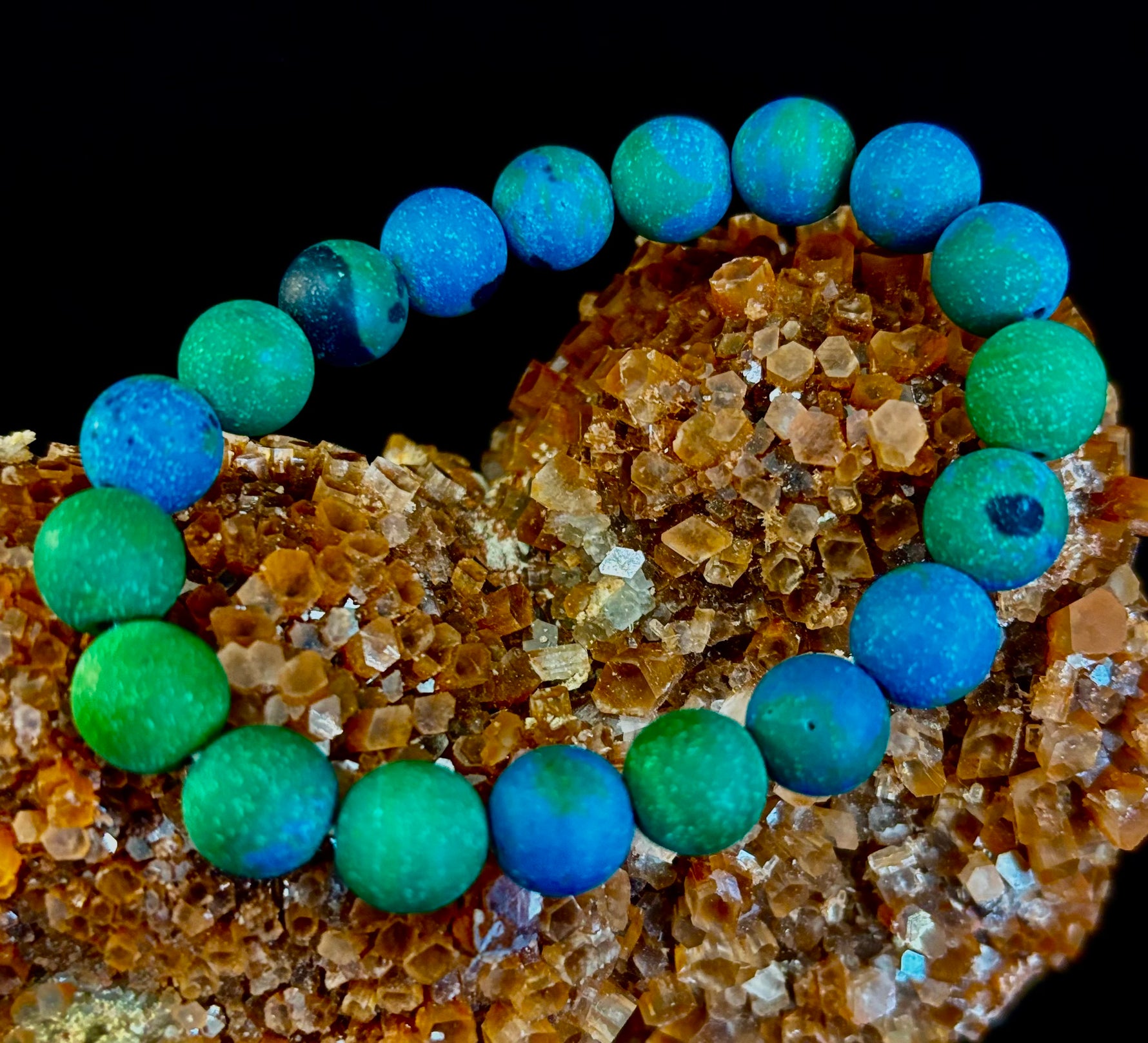 Tap into clarity, intuition, and grounded calm with this genuine Matte Azurite Energy Bracelet. Crafted from smooth 10mm natural azurite beads in stunning ocean-blue and earthy green tones, this piece carries a bold yet soothing presence — perfect for everyday wear or intentional energy work.