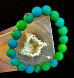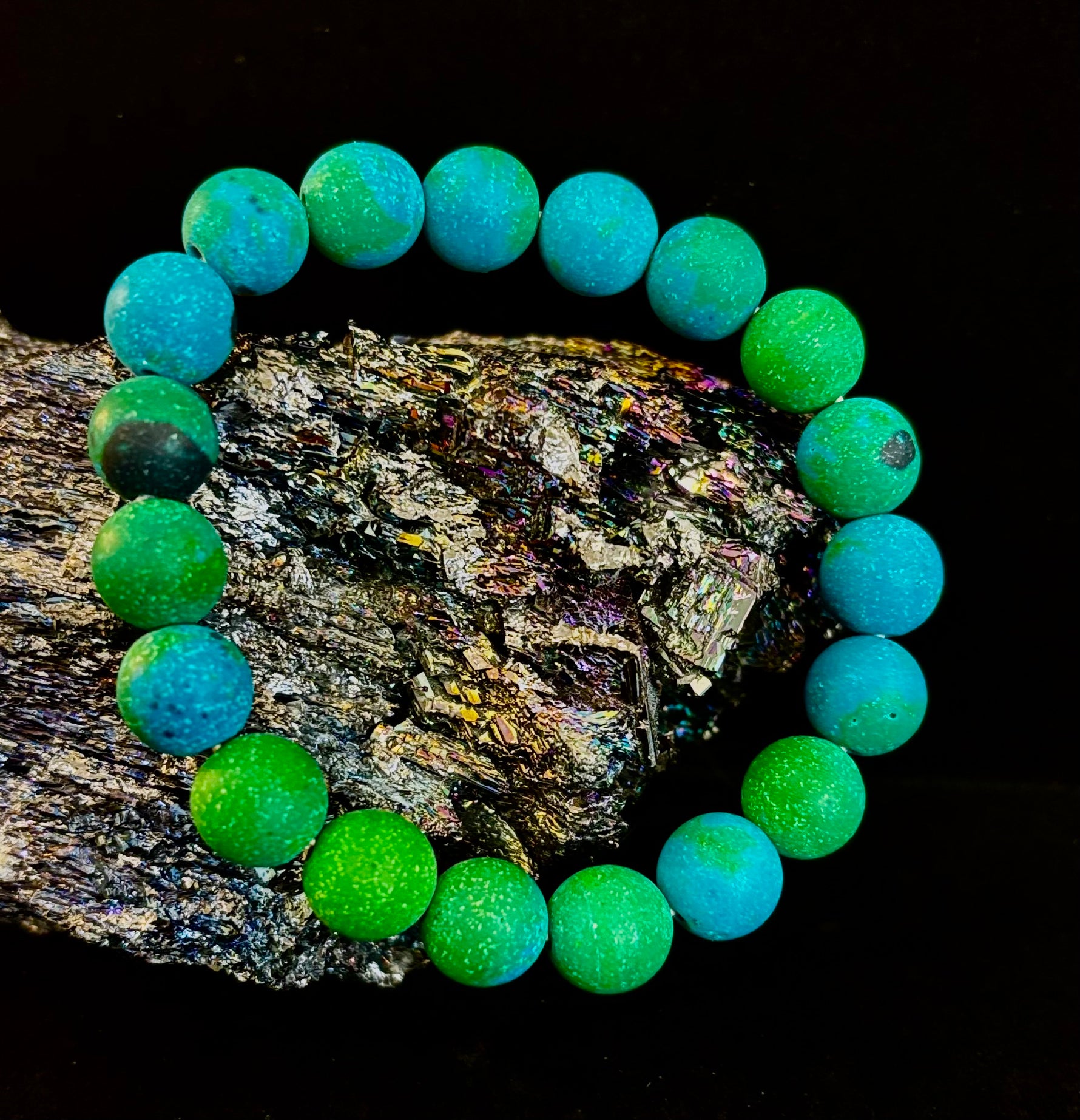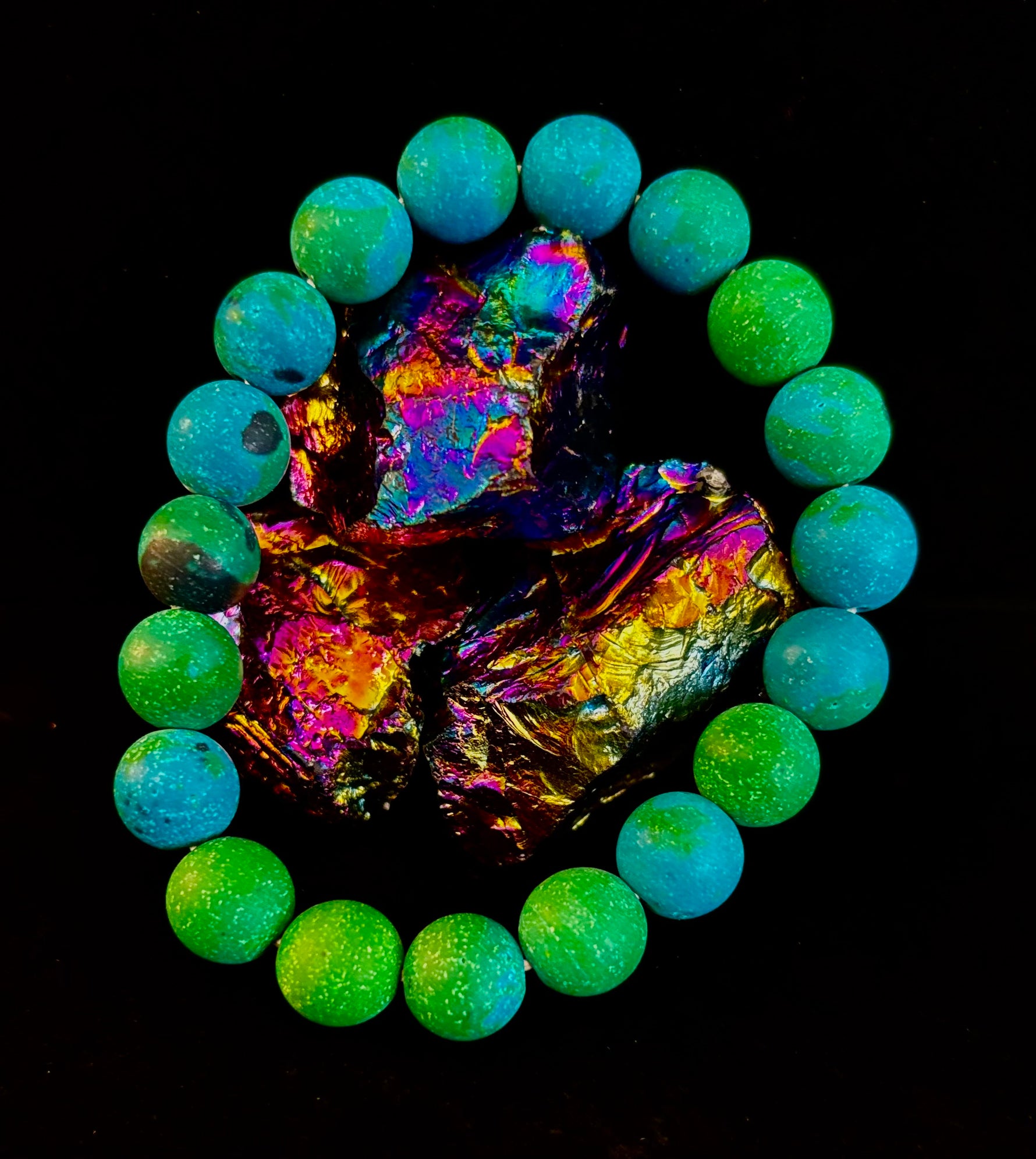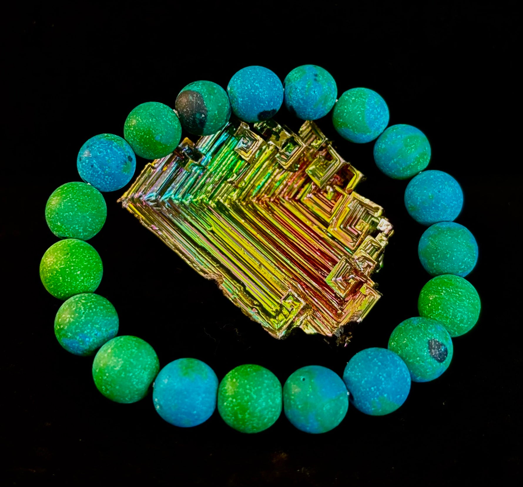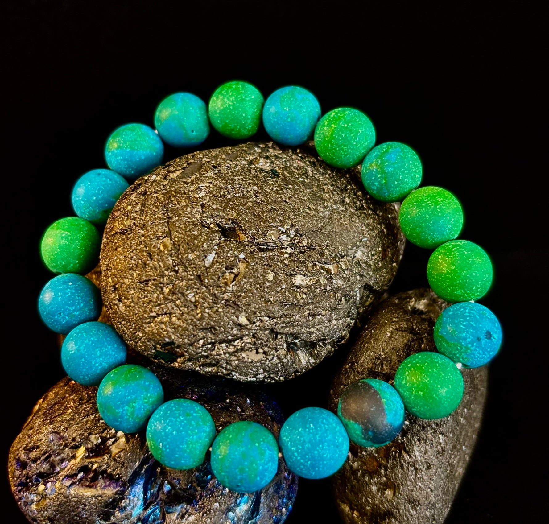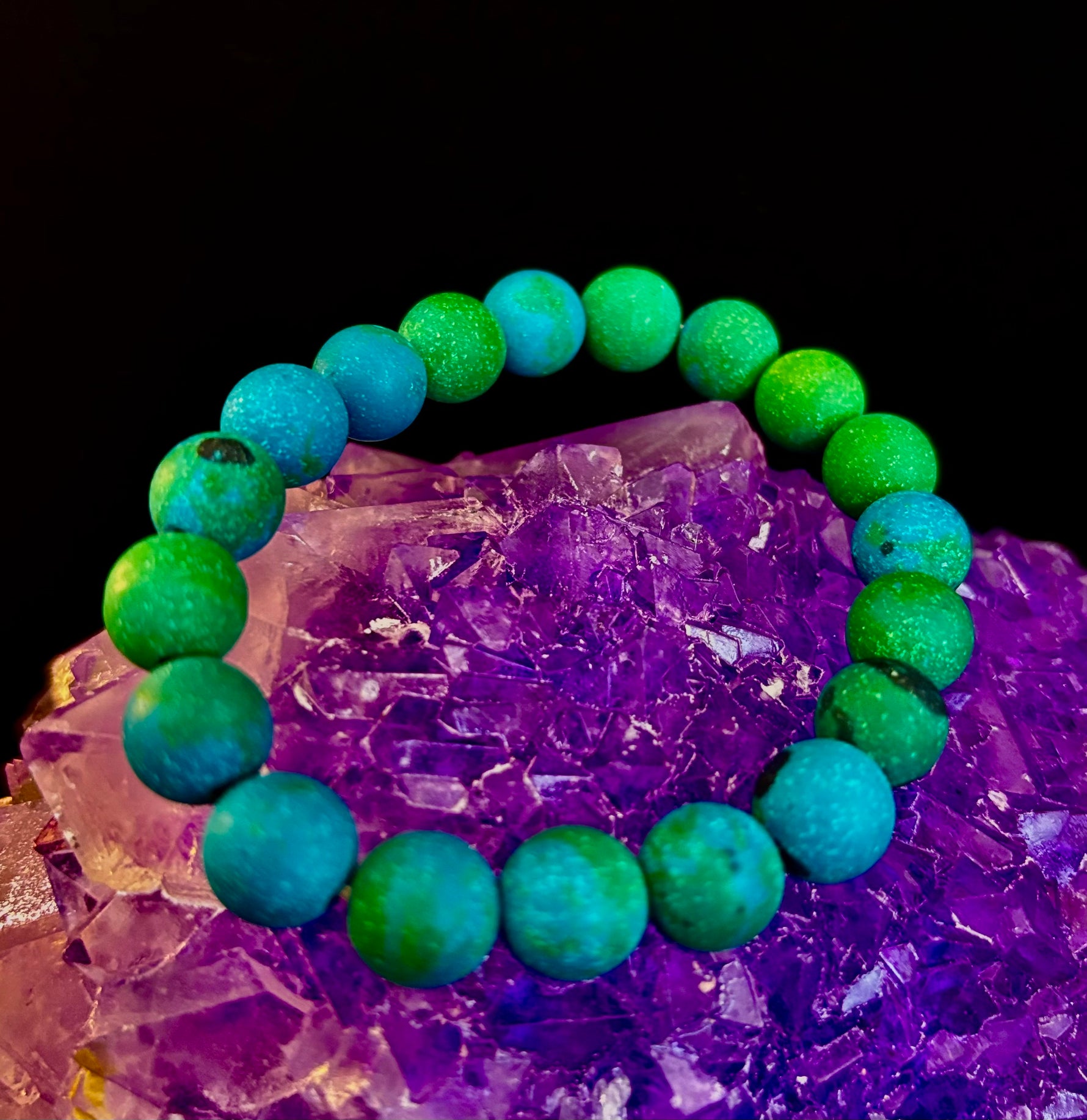 Tap into clarity, intuition, and grounded calm with this genuine Matte Azurite Energy Bracelet. Crafted from smooth 10mm natural azurite beads in stunning ocean-blue and earthy green tones, this piece carries a bold yet soothing presence — perfect for everyday wear or intentional energy work.