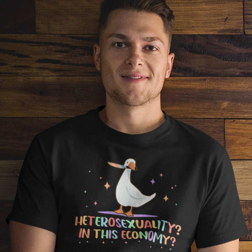 Introducing our wicked funny "Heterosexuality? In this Economy?" Short Sleeve Tee, the ultimate blend of comfort and style. This tee emits a relaxed vibe that’s perfect for everyday wear. Its lightweight, breathable fabric makes it an ideal choice for both active outings and cozy lounging at home. With its versatile retail fit and classic crew neckline, it’s easy to dress up with accessories or wear casually with jeans.