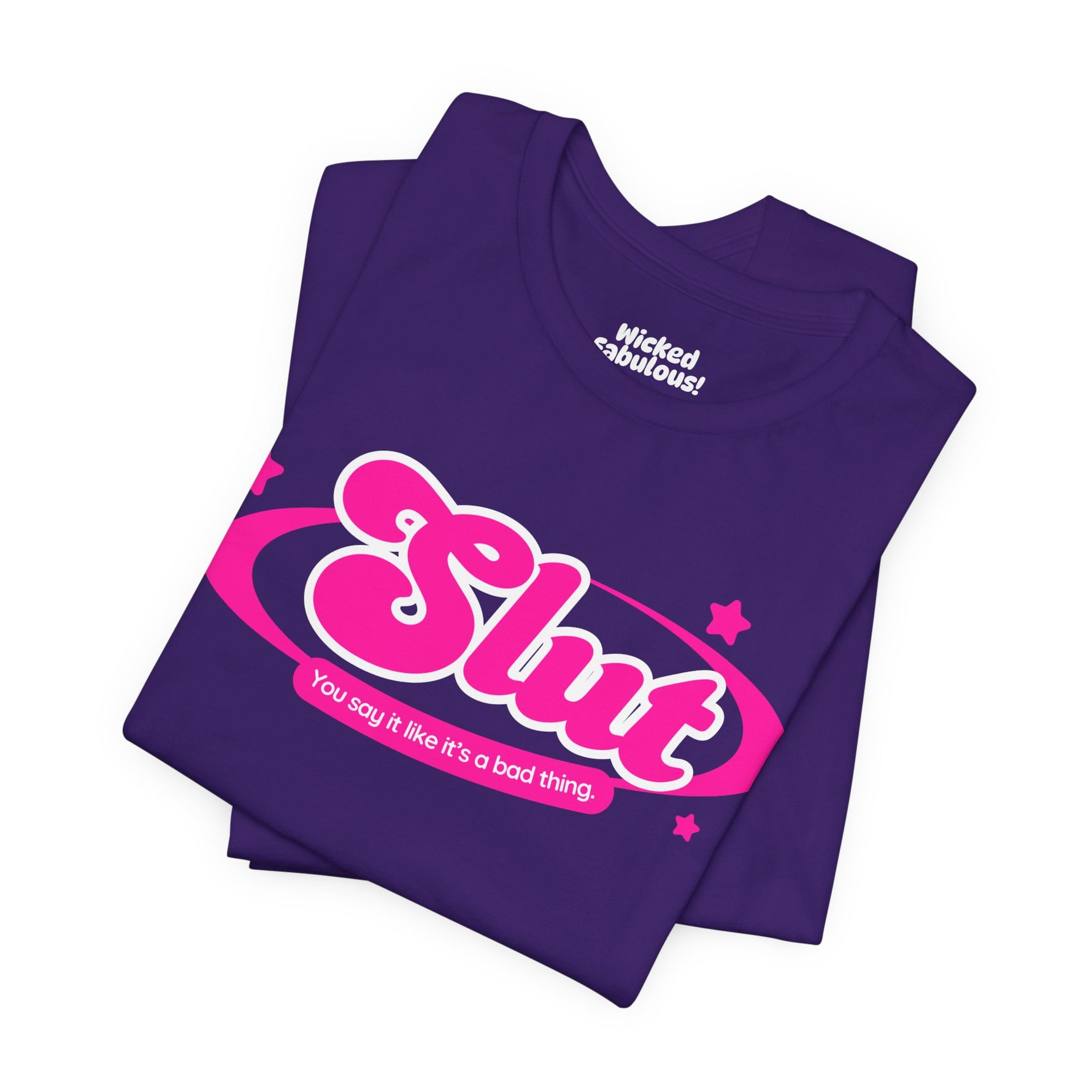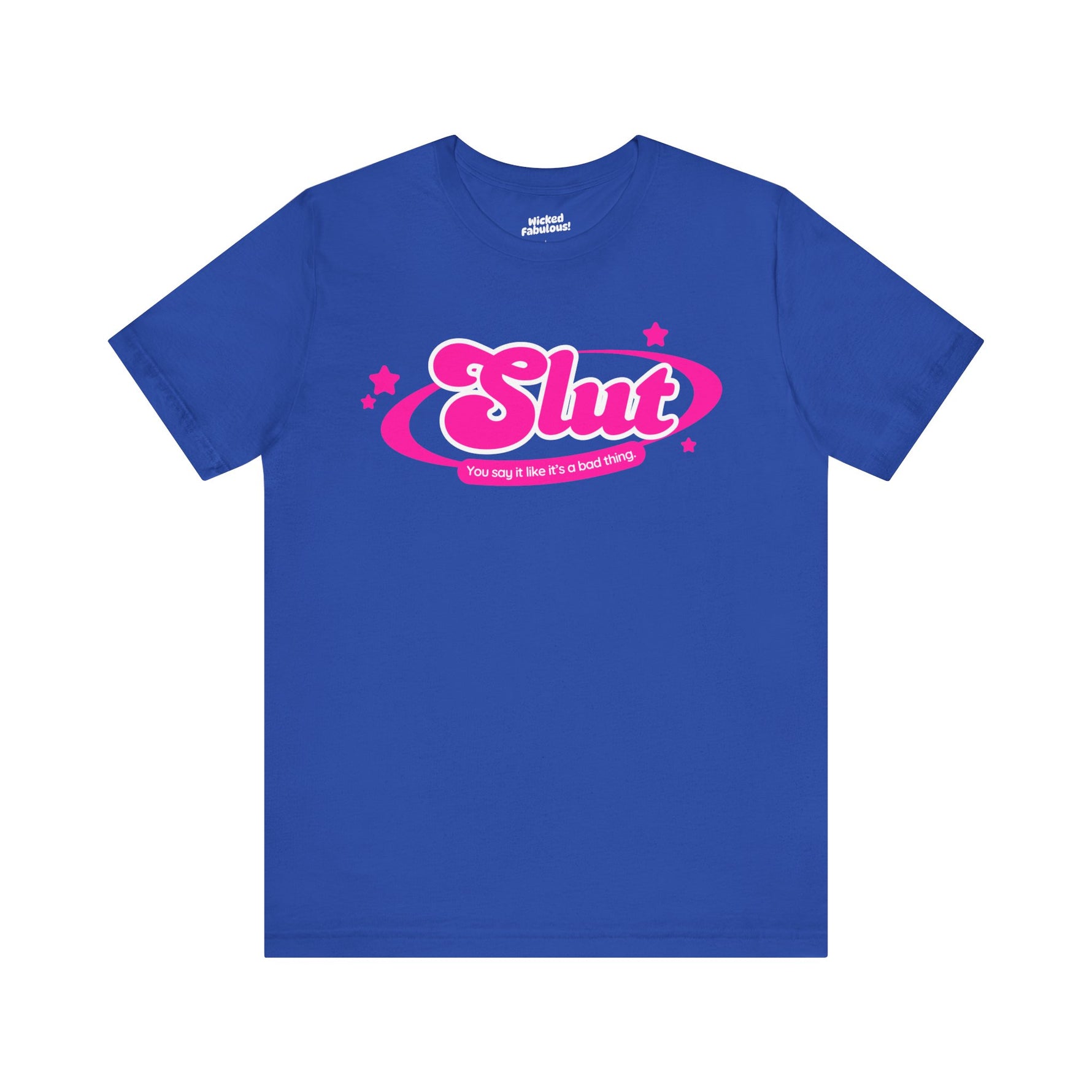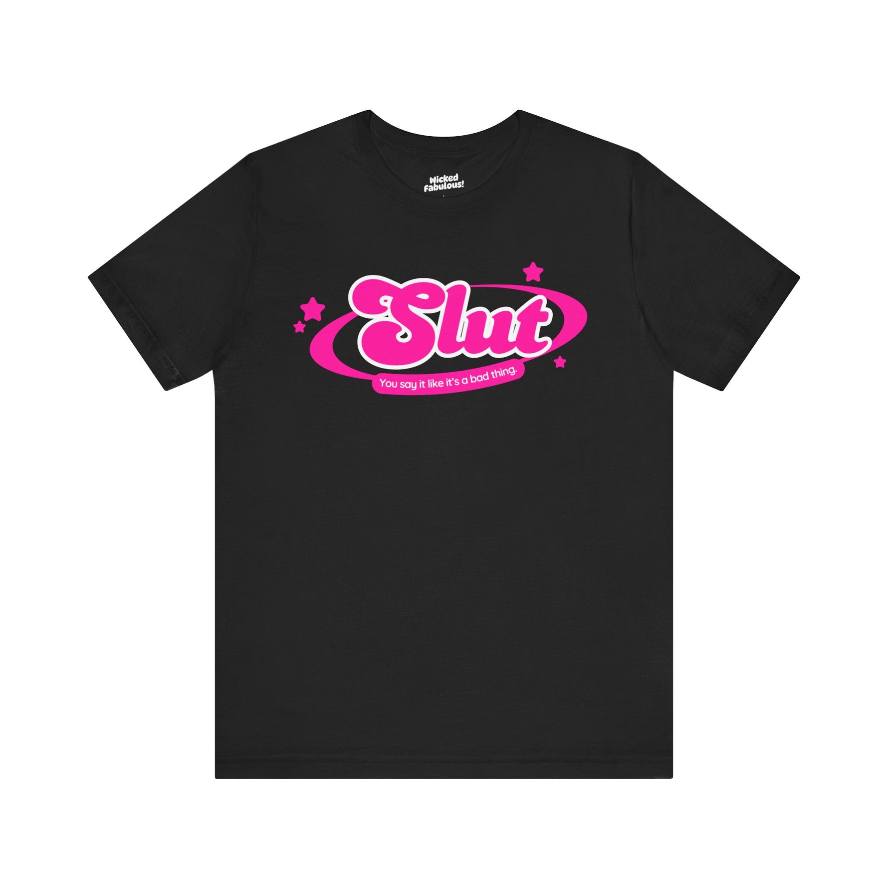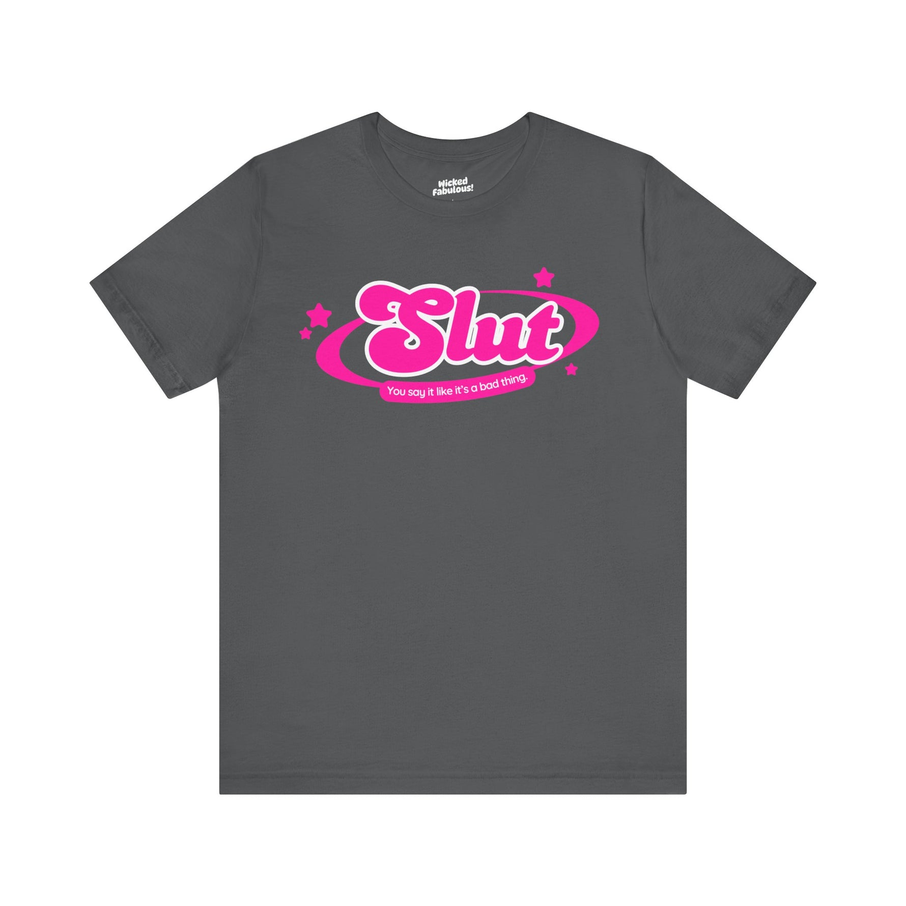 Embrace your bold side with our "Slut - You Say it Like It's a Bad Thing!" short sleeve tee. Made from 100% Airlume combed and ring-spun cotton, it offers a soft and breathable feel, perfect for both casual outings and relaxed evenings at home. The vibrant design adds a playful touch, making it a great statement piece for parties or everyday wear. Designed for adults, this tee is a must-have for those who celebrate individuality and self-expression. Ideal for gifting during occasions like Pride Month, birthdays, or any casual celebration, it’s sure to bring a smile to your loved ones. Elevate your wardrobe with a blend of comfort and attitude!