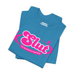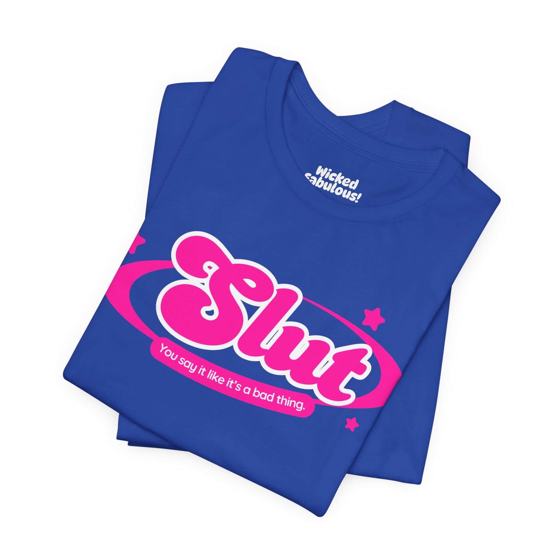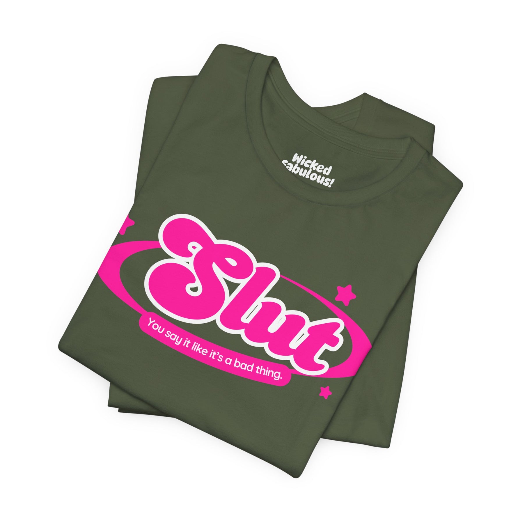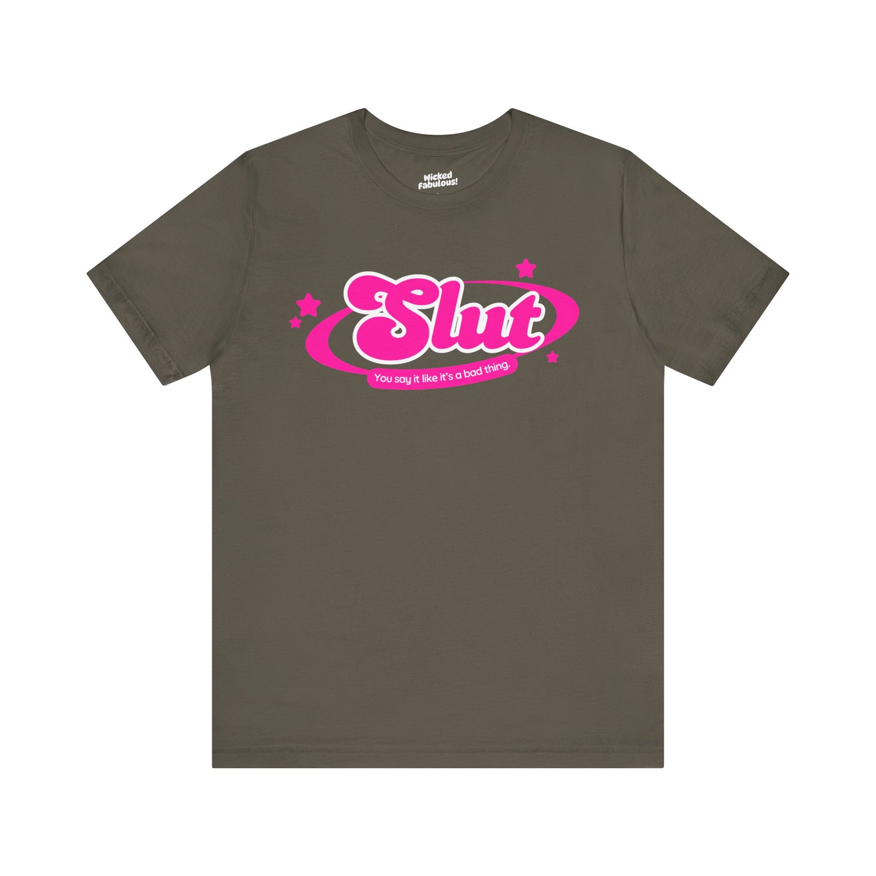 Embrace your bold side with our "Slut - You Say it Like It's a Bad Thing!" short sleeve tee. Made from 100% Airlume combed and ring-spun cotton, it offers a soft and breathable feel, perfect for both casual outings and relaxed evenings at home. The vibrant design adds a playful touch, making it a great statement piece for parties or everyday wear. Designed for adults, this tee is a must-have for those who celebrate individuality and self-expression. Ideal for gifting during occasions like Pride Month, birthdays, or any casual celebration, it’s sure to bring a smile to your loved ones. Elevate your wardrobe with a blend of comfort and attitude!