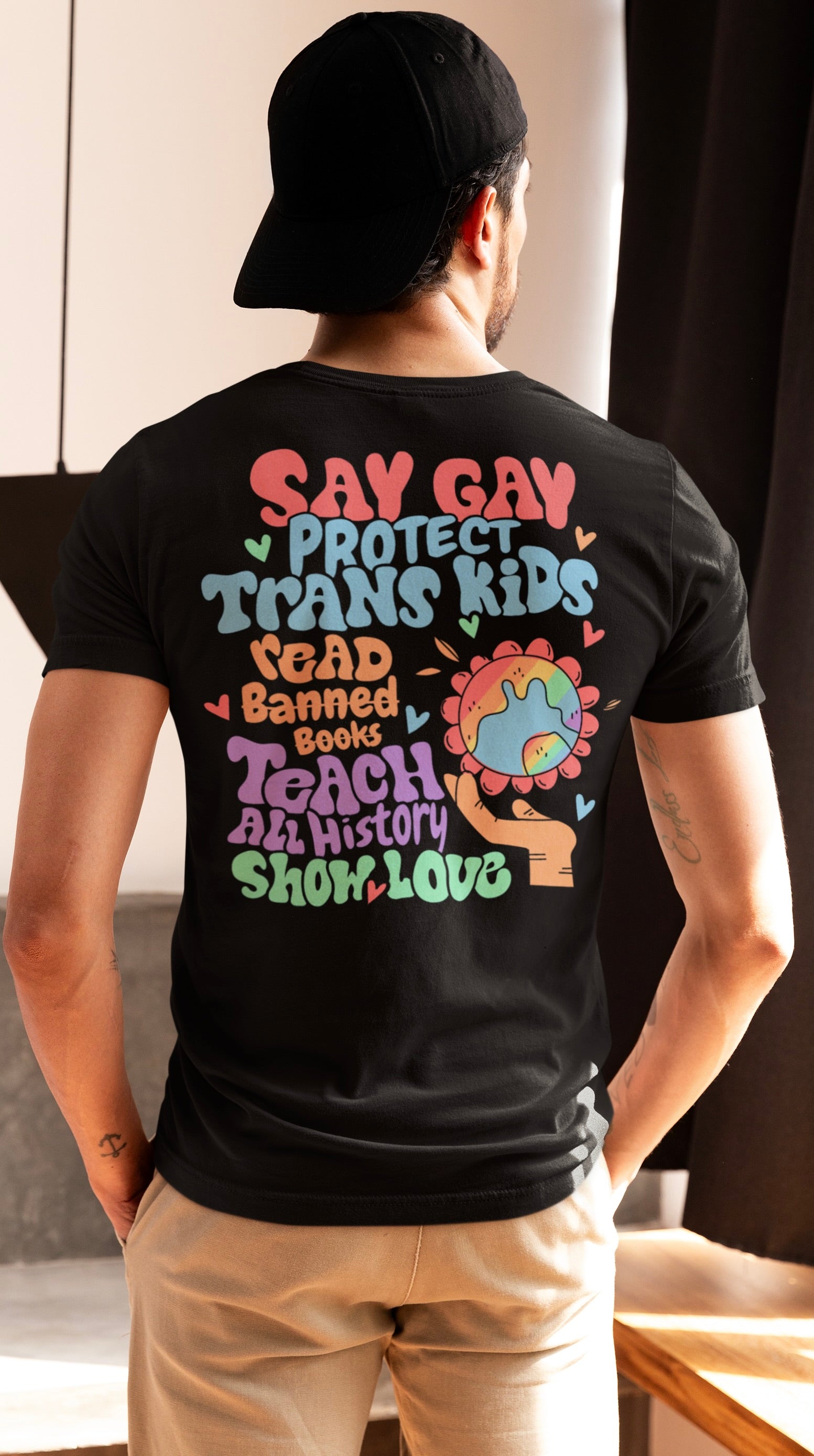 Introducing our Say Gay, Protect Trans Kids, Read Banned Books, Teach All History, Show Love Short Sleeve Tee, a vibrant statement piece bursting with positivity and inclusivity. This comfortable tee showcases a colorful design that radiates joy, making it the perfect addition to your casual wardrobe. Whether you’re heading to a pride event, a cozy get-together, or simply lounging at home, this shirt serves as a reminder to celebrate love and equality. Ideal for anyone looking to express their values, it’s especially relevant during Pride Month and other social justice celebrations. Feel good about sporting this tee, knowing it’s made with sustainability in mind and designed for all body types!