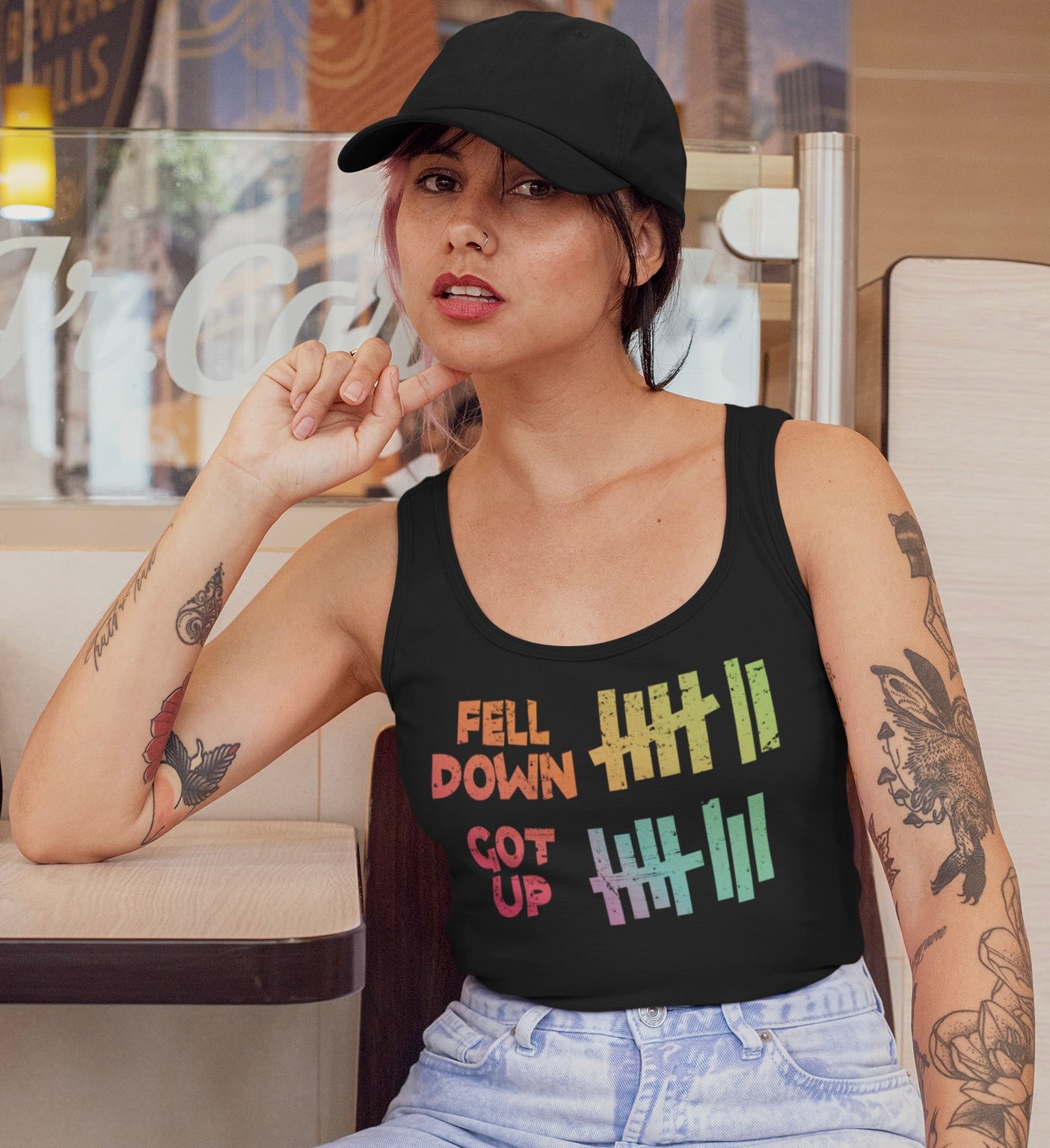 Resilience looks good on you — especially in our “Fell Down, Got Up” Pride Tank Top.