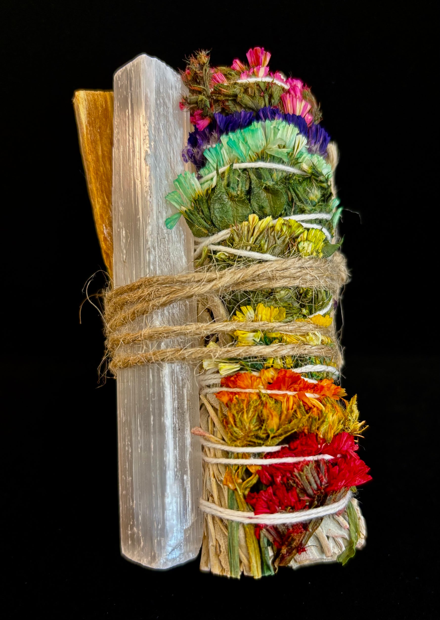 🌈 Chakra Florals: Each bundle is adorned with vibrant, dried flowers representing the 7 chakras—bringing alignment, balance, and color to your energy field.
