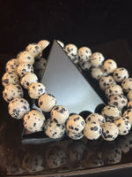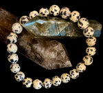 Bring grounding energy and joyful spirit into your day with our Dalmatian Jasper Bracelet, handcrafted with your choice of 8mm or 10mm natural gemstone beads. Known for its distinctive black spots on a creamy white background, Dalmatian Jasper is as eye-catching as it is healing.