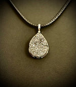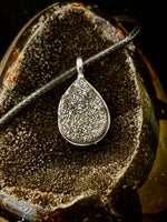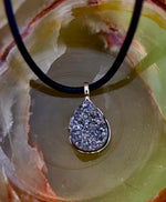 Add a touch of shimmer and sophistication with our Silver Druzy Teardrop Pendant Necklace, a petite piece that effortlessly blends modern design with timeless energy. Crafted with care and set on a 23-inch black cord, this 18mm pear-shaped pendant (between 1/2 inch and 3/4 inch long) features a sparkling druzy stone that catches the light from every angle — symbolizing clarity, confidence, and transformation.